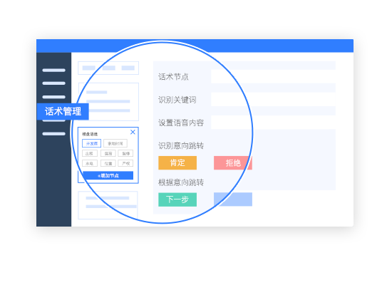 可視化竹簡法話術(shù)配置,可實(shí)現(xiàn)話術(shù)在線配置,自由跳轉(zhuǎn),所見即所得,2-4小時輕松完成上線;